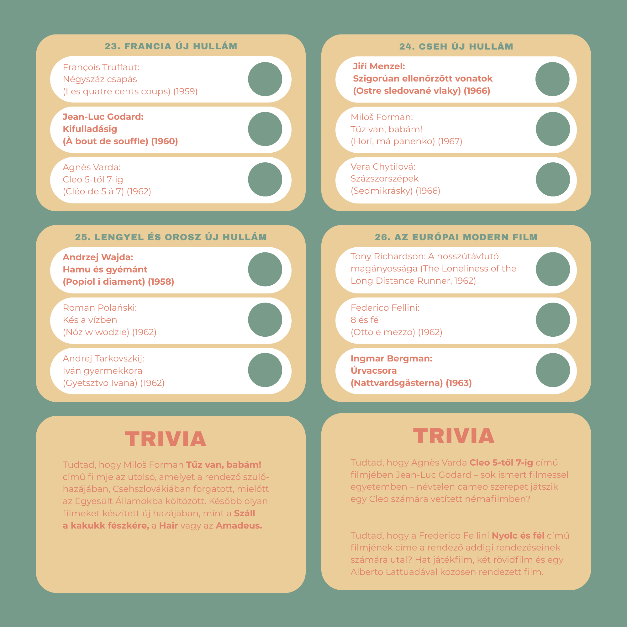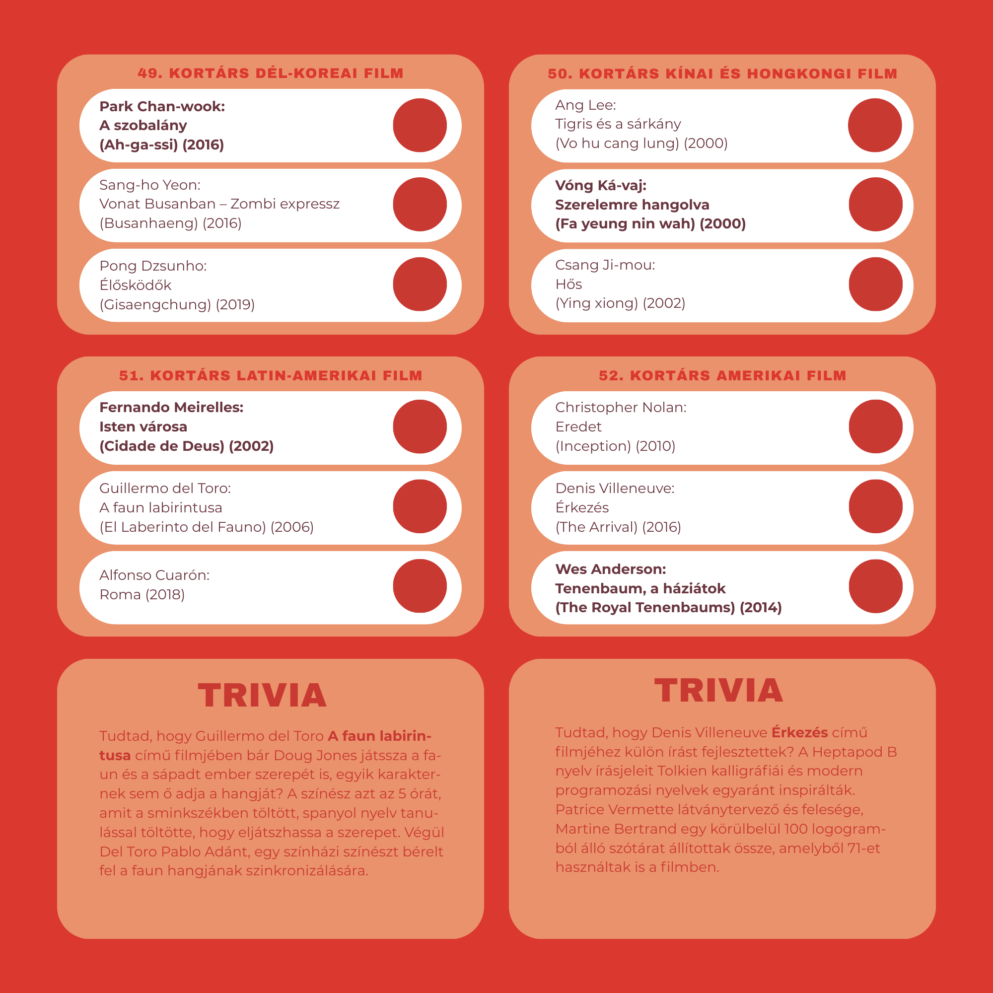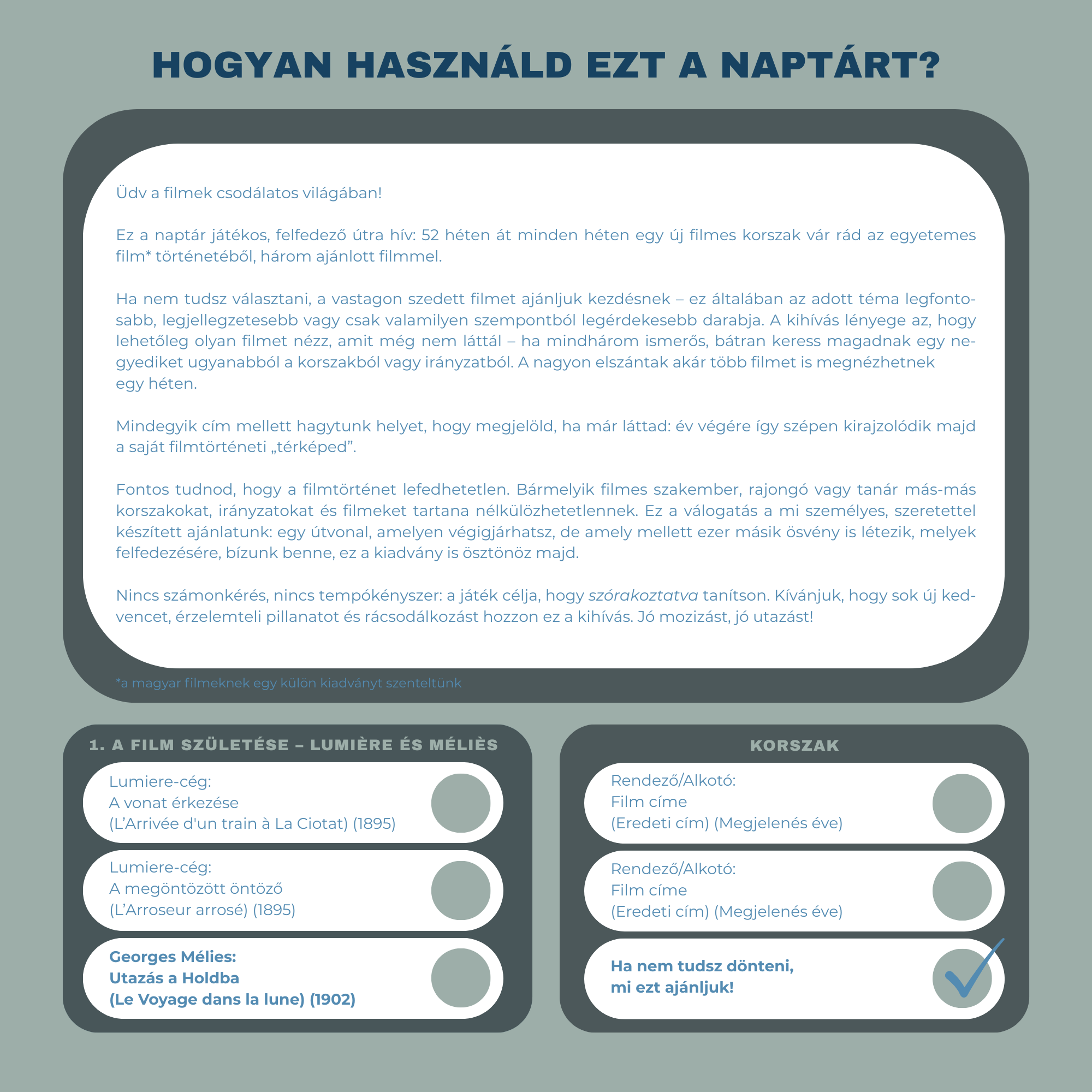 Egy évnyi moziélmény: 52 hét, 52 filmtörténeti korszak, heti 3 ajánlott film egy gyönyörűen illusztrált, sorszámozott, egyedileg szignózott lemeznaptárban.