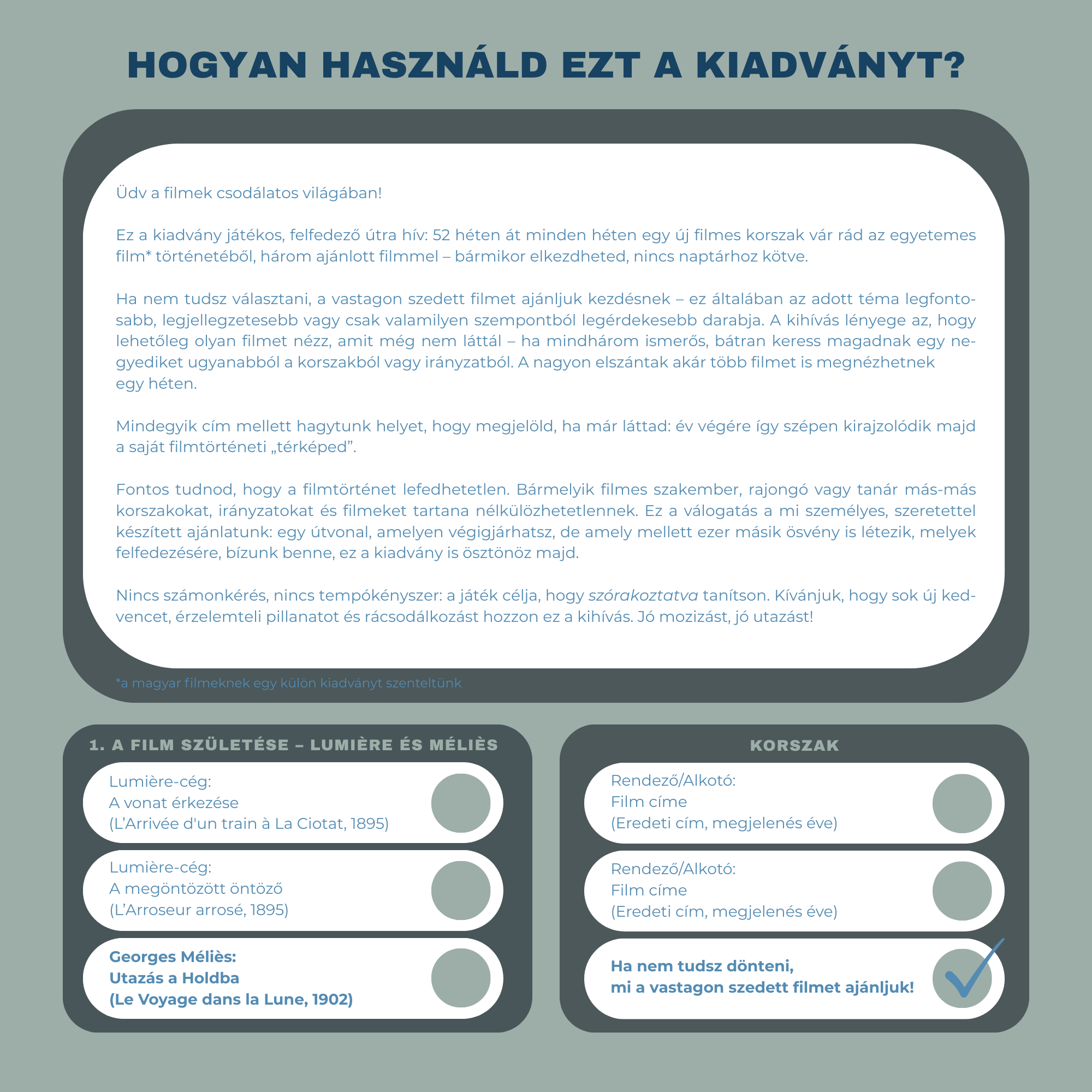 Egy évnyi moziélmény: 52 hét, 52 filmtörténeti korszak, heti 3 ajánlott film egy gyönyörűen illusztrált, sorszámozott, egyedileg szignózott kiadványban.